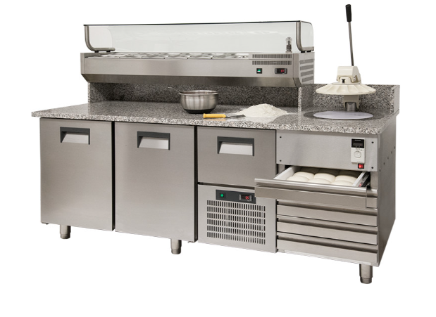 Aceste echipamente includ, în principal, mese frigorifice pentru pizza cu blat de lucru (de obicei din granit), vitrine refrigerate pentru ingrediente și spații de depozitare integrate, care permit operatorului să pregătească pizza într-un singur punct de lucru. Prin această configurație, ingredientele sunt menținute la temperatură controlată, iar procesul de asamblare devine mai rapid și mai ergonomic.
