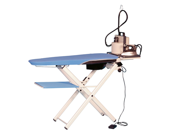Masă de călcat pliabilă cu sistem de aspirație, fier de călcat cu abur și boiler mic. Dimensiuni: 850x380x250 mm. Înălțime reglabilă.